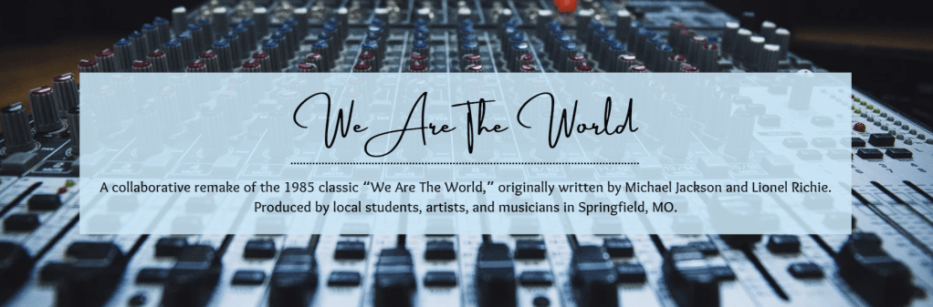 We Are the World 417 is a collaborative project being put together by a group of Electronic Arts students at Missouri State University. This project is a recreation of the original 1985 music video of “We Are the World,” originally written by Lionel Richie and Michael Jackson.